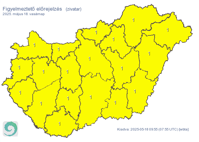 Frissítette veszélyjelzését vasárnap délelőtt az Országos Meteorológiai Szolgálat (OMSZ): az ország teljes területére érvényben van a zivatarokra vonatkozó figyelmeztetés. A déli és délutáni órákban várhatóan több helyen alakulnak ki záporok, zivatarok, amelyek nemcsak az intenzív esőzés, hanem jégeső és viharos erejű szél miatt is veszélyt jelenthetnek.