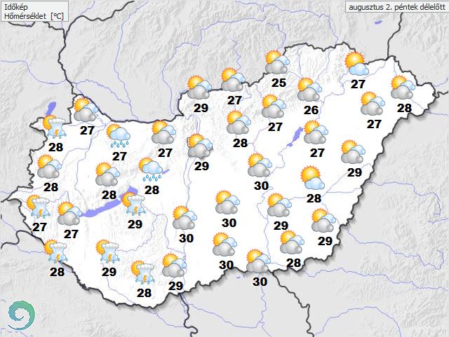 A legmagasabb nappali hőmérséklet pénteken általában 29 és 34 fok között várható.