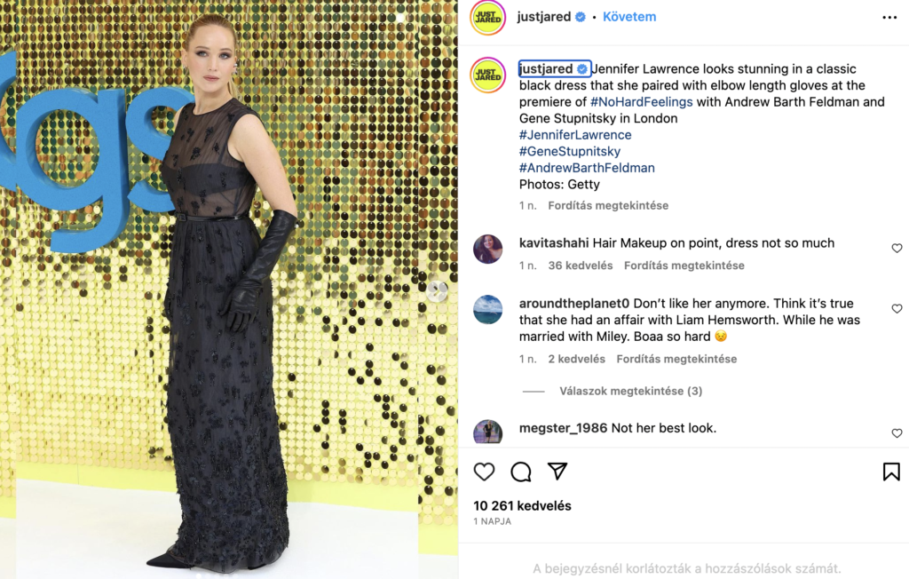 Amikor eljött a vörös szőnyeg pillanata, Jennifer Lawrence egy átlátszó selyemruhát viselt, ami a Christian Dior 2023-as őszi-téli kollekciójának egy gyönyörű darabja volt. A ruhát Anita Ko ékszerekkel egészítették ki. A ruha felső része teljesen átlátszó volt, és kilátszódott a színésznő fekete melltartója is. A csillogó részletekkel díszített ruhát a hosszú fekete bőrkesztyű tette igazán elegánssá.