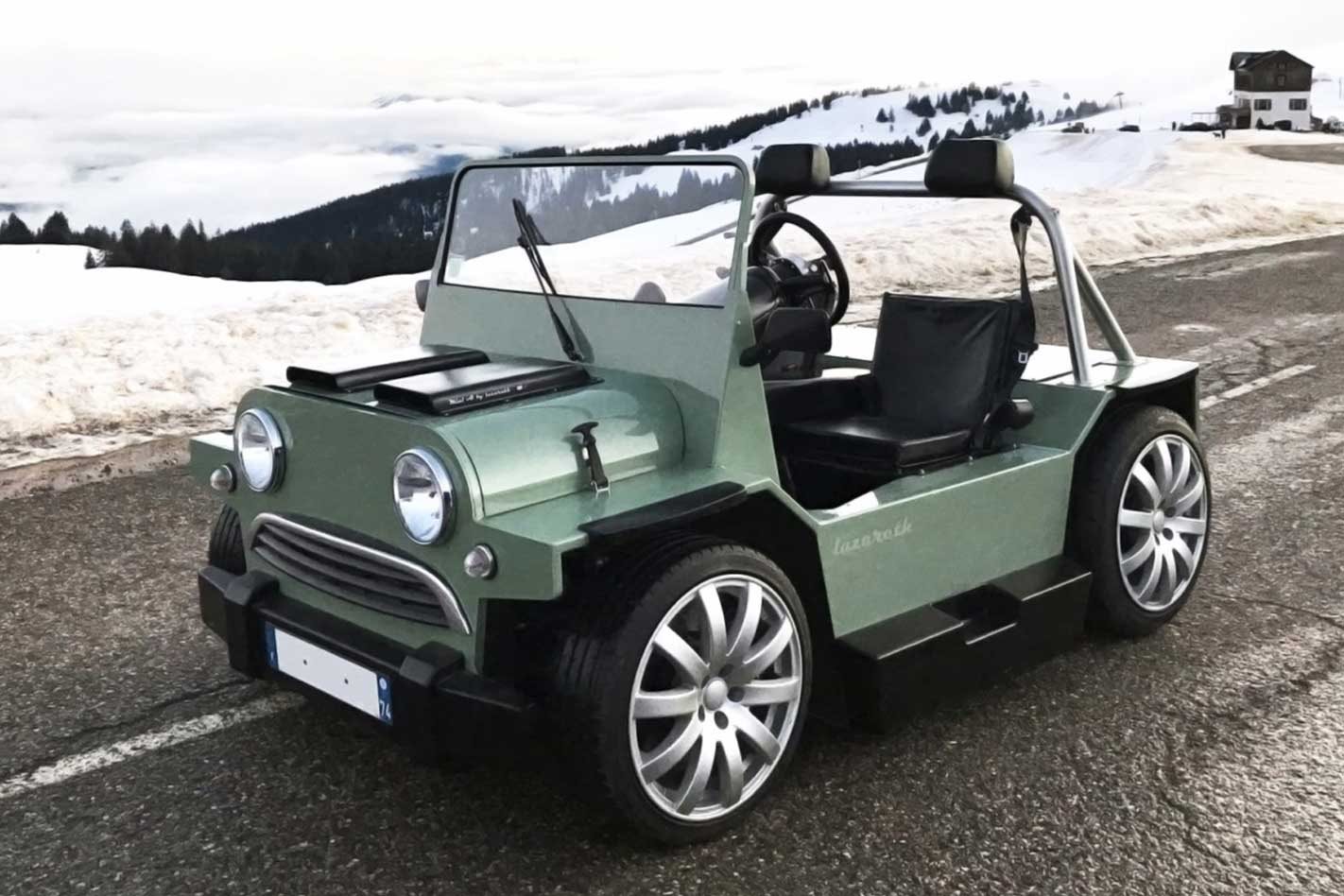 850 kg, leginkább úgy néz ki mint egy golfkocsi, de van benne egy 460 lóerős Ferrari motor. Eszelősnek eszelős, de nem is vártunk mást a Lazareth-től.