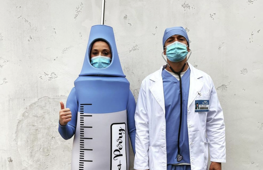 Egyesek szerint ízléstelen egy világjárvány negyedik hullámában vakcinákkal viccelődni, de Katy Perry poénnak szánta a jelmezt. Férje, Orlando Bloom mellette az orvos...