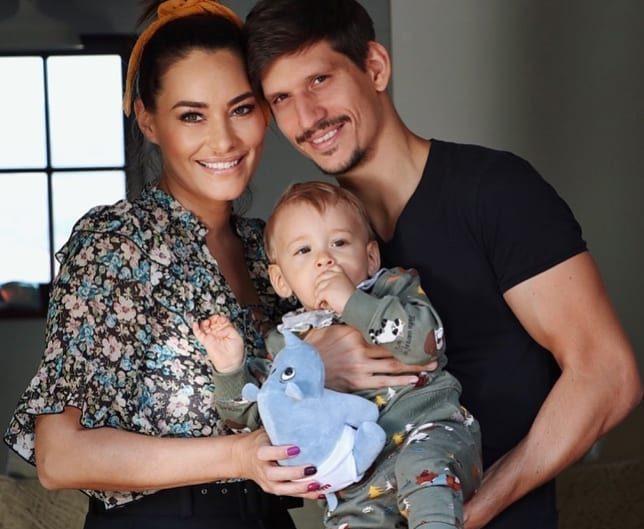 A férjével és a gyermekével mosolyognak a kamerába.