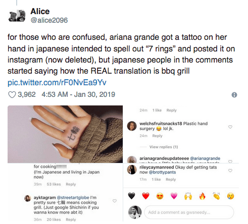 Az énekesnő új tetoválása reményei szerint új dalára, a 7 rings-re utalt volna, csak épp... hmmm.... sajnos a valóságban a valóságban a grillsütő az, amire referál...