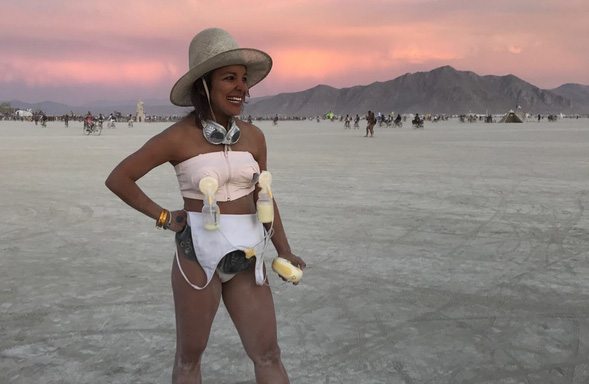 Külön erre a célra tervezett pumpás melltartóban tolta a bulikát a sivatagban.