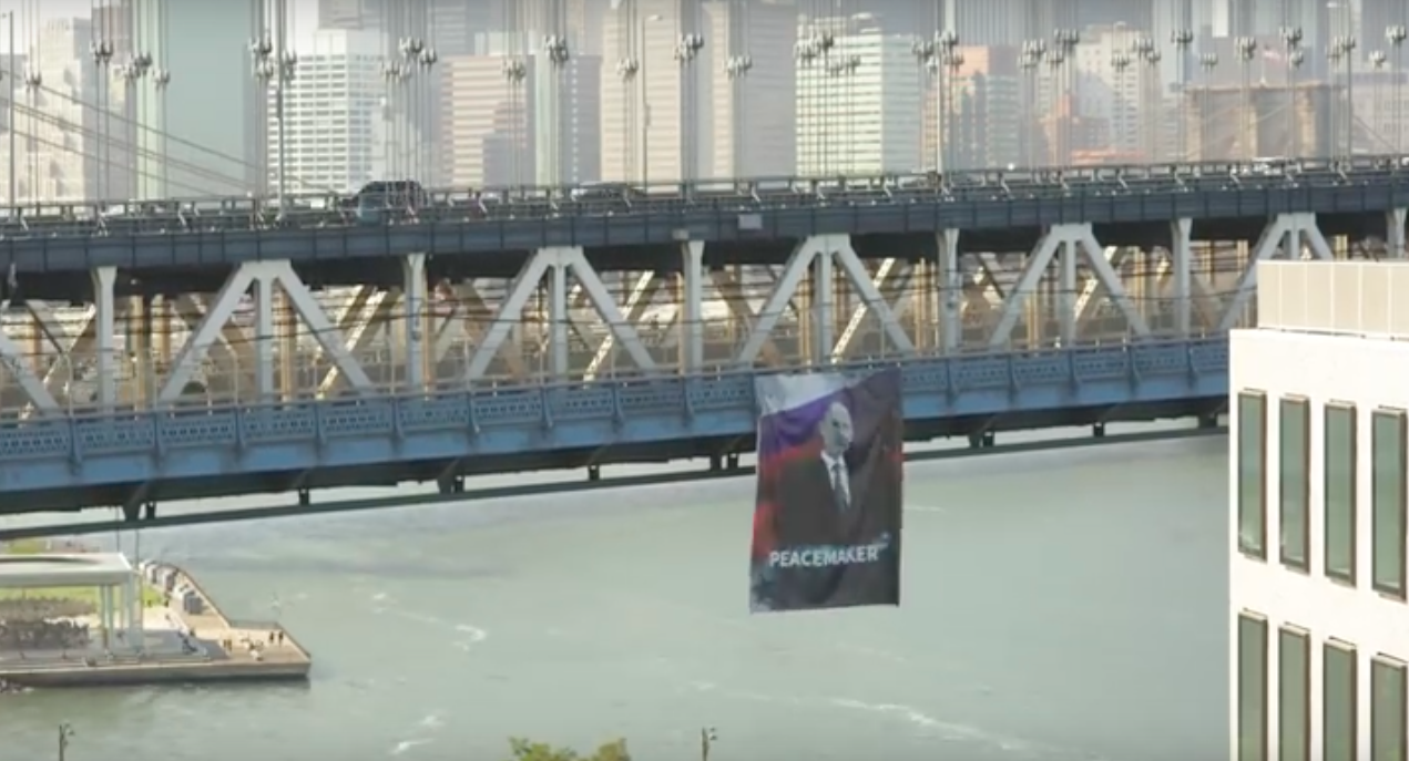 Meghekkelték New Yorkot az oroszok, az orosz elnököt ábrázoló hatalmas molinó egy órán keresztül lengedezett a Manhattan hídon.