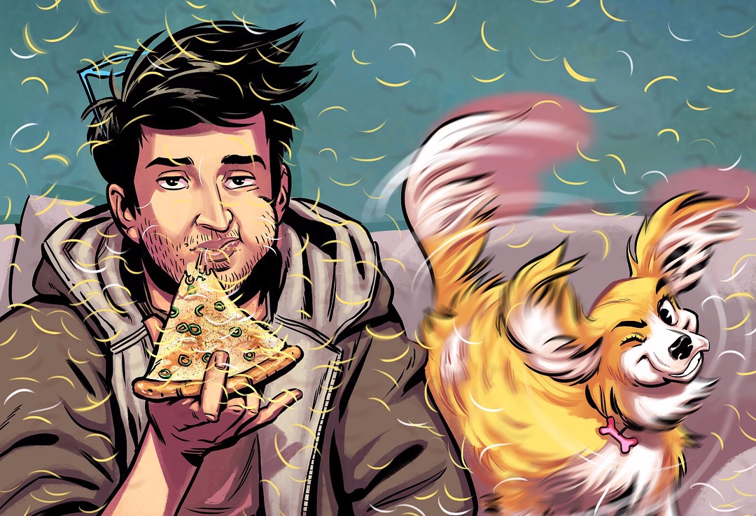 Erez Zadok képregényes stílusban rajzol, többnyire kutya-ember témában.