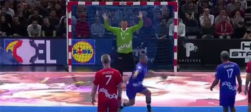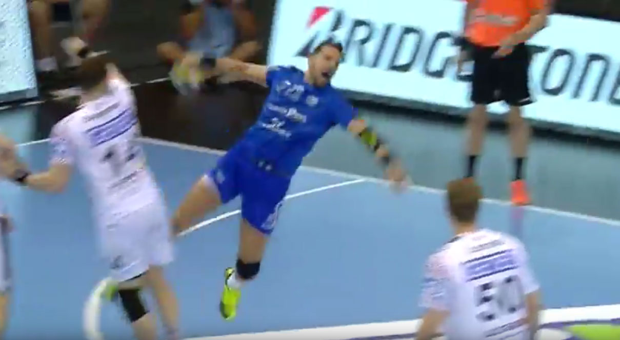 A Győr irányítója szélről is klasszis megoldásokra képes, a férfi mezőnyben is ritka az ennyire trükkös lövés.