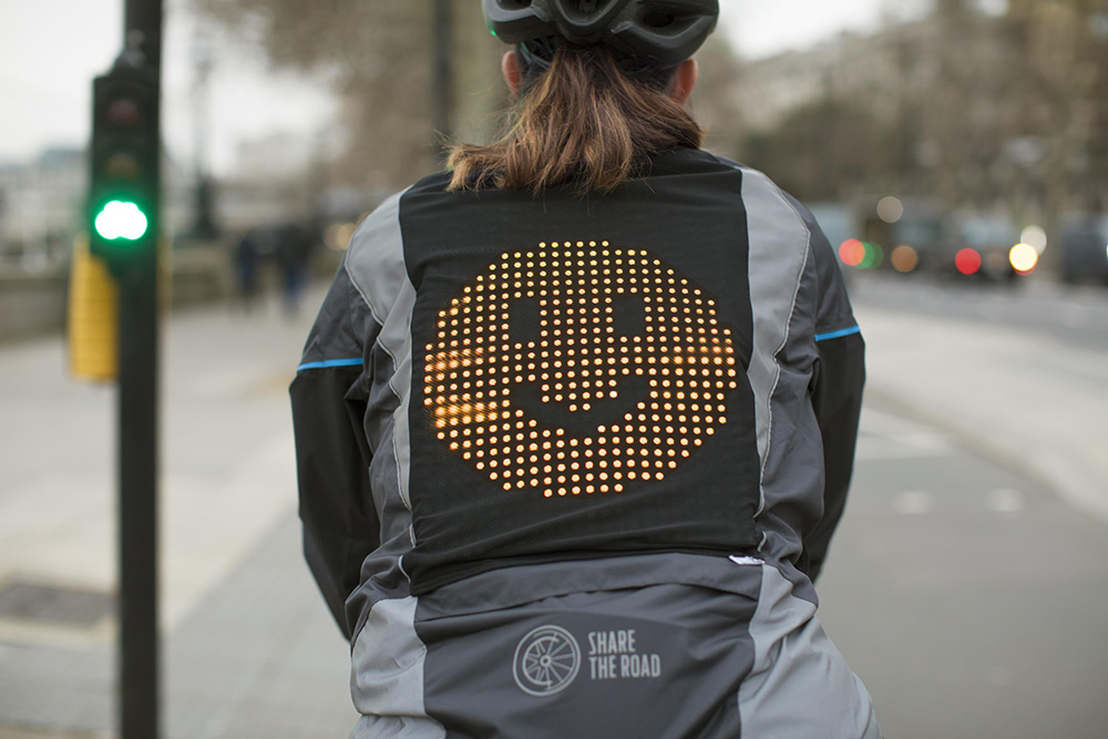 Sokkal hasznosabb, mint amire először gondol az ember. A kerékpáros dzsekit hátulján LED-es kijelző van, amely különféle hangulatjeleket tud megjeleníteni.