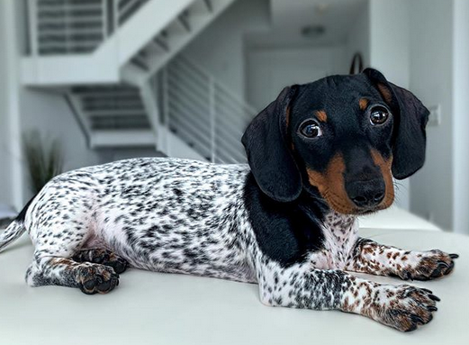 Moo, a Miamiban élő tacskó kisfiú alsóteste fehér alapon fekete pöttyös, mintha csak dalmát kutyuska volna.