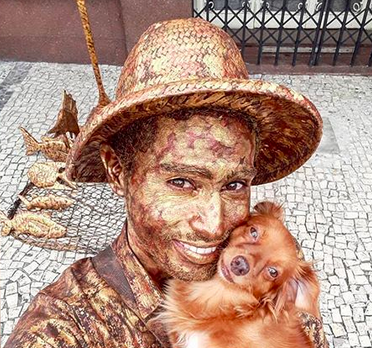 Yorge Luís Ruiz brazil utcai művész élőszobor-kompozícióiba kutyását, Jaspe-t is bevonja. És hát ez így persze, hogy kiemeli őt az utcai mozgószobrok tömegéből...