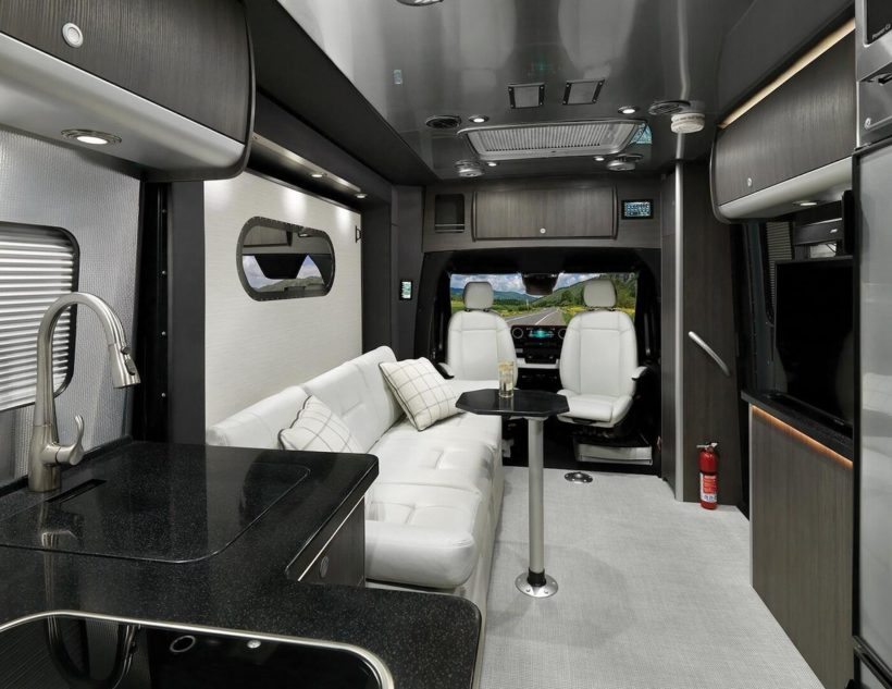 De ez a kanapé ággyá alakítható, amely beépített könyvespolcokat és USB-töltőportokat tartalmaz. A vásárló kap még egy jól felszerelt konyhasarokot, amely egy kényelmes fürdőszoba mellett áll. Az Airstream és a Mercedes-Benz kiváló munkát végzett a fürdőszobával, zuhanyzóval, porcelán WC-vel és cédrusfa borítású tárolószekrénnyel szerelték fel.