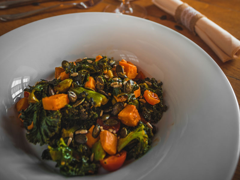 A fodros kelt az édesburgonyánál egy kicsivel hosszabb ideig kell párolni, ezért először a kelt tedd fel 2 szétdarabolt fokhagymagerezd társaságában párolni. Tegyél hozzá 6-8 koktélparadicsomot, és sózd majd locsold meg egy nagyon kevés vízzel. Fontos, hogy pár perc alatt el tudjon párologni. A fodros kelt összesen nagyjából 8 percig párold, majd tegyél hozzá egy evőkanál vajat, amit szépen lassan keverj bele, és végül mehet bele a felkockázott édesburgonya. Ezután ha szeretnéd, megbolondíthatod némi jalapeno paprikával, és a feldarabolt avokádót is hozzáadhatod. Elég, ha épp csak átmelegszik. Végül pirítsd meg a fenyőmagot (vagy tökmagot), de vigyázz, mert nagyon könnyen odaéghet! Az elkészült fogás friss salátalevelekkel és pirított magvakkal egyszerűen fenséges.