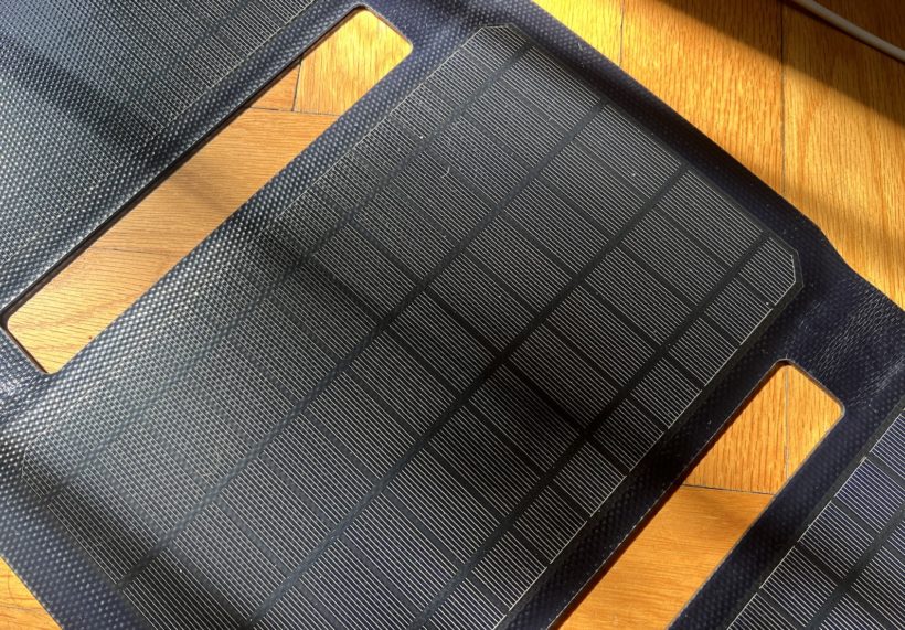 Az összecsukható napelem 6 monokristályos napelemre nyitható ki, így akár 40 W kombinált teljesítményt biztosít, már ha minden körülmény ideális. Én kétféleképpen is teszteltem, de erről majd később.