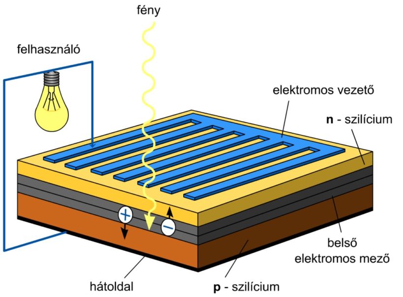 Amikor a napelemekre napfény esik, a napfény fotonokból áll, és ezeket a fotonokat az napelemek felszínén található szilíciumsejtek abszorbálják, majd amikor a fotonok ütköznek a szilíciumsejtekkel, energiát adnak át az elektronoknak, és az elektronok elkezdenek mozogni. Ez a folyamat az ún. fotovoltaikus hatás, amely során a napenergiából elektromos áram keletkezik.